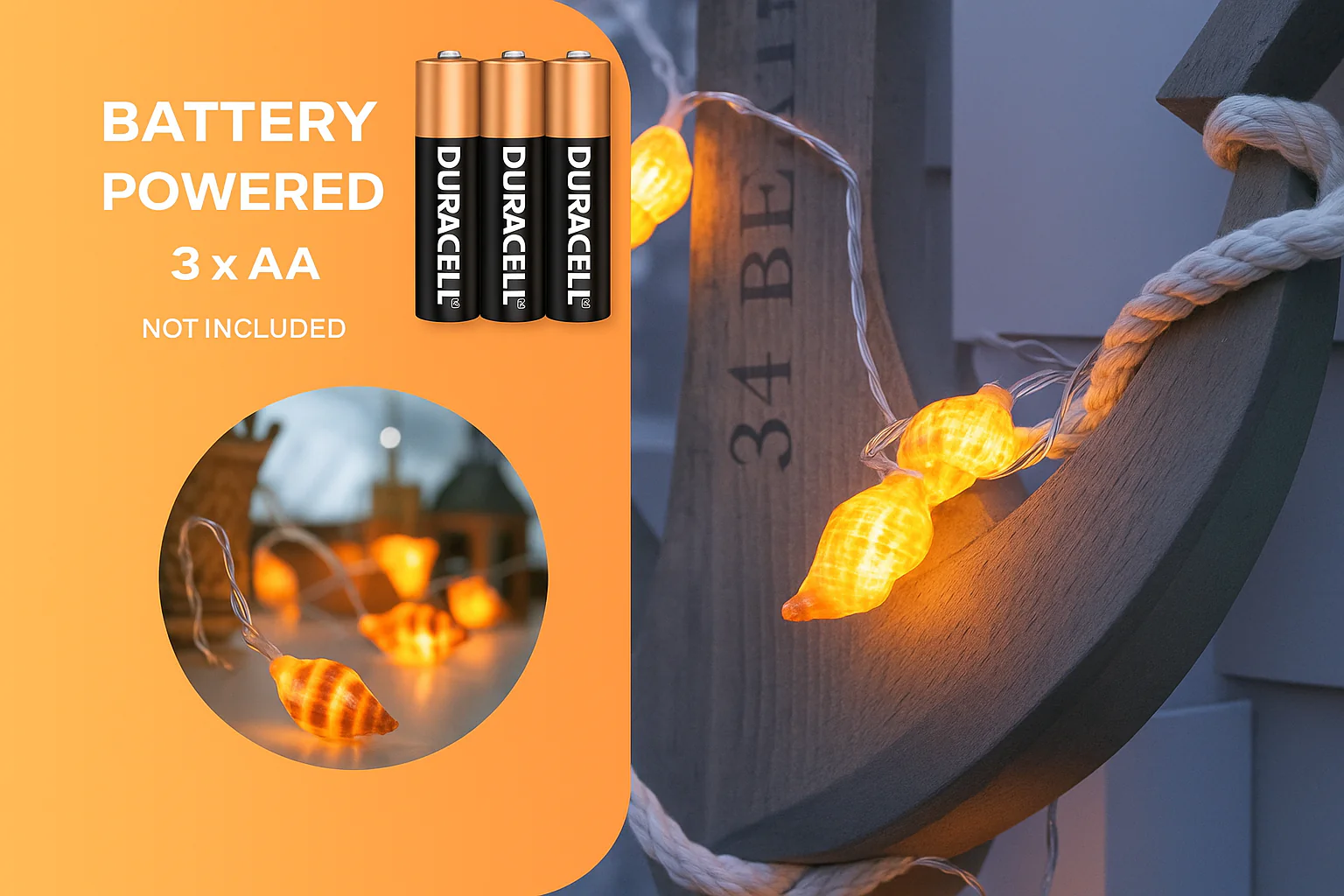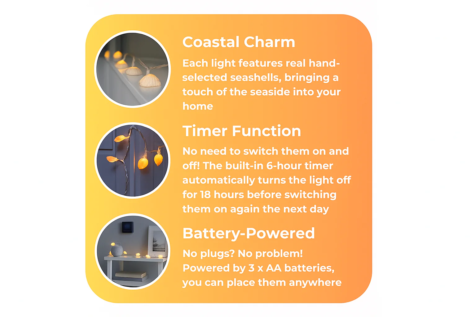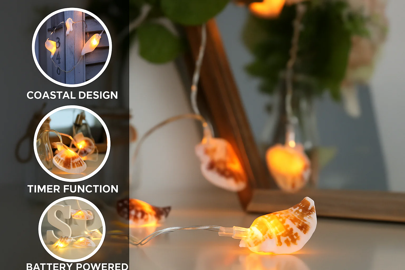 Natural Sea Shell Design – Each LED is encased in a real sea shell, offering an authentic coastal aesthetic.
