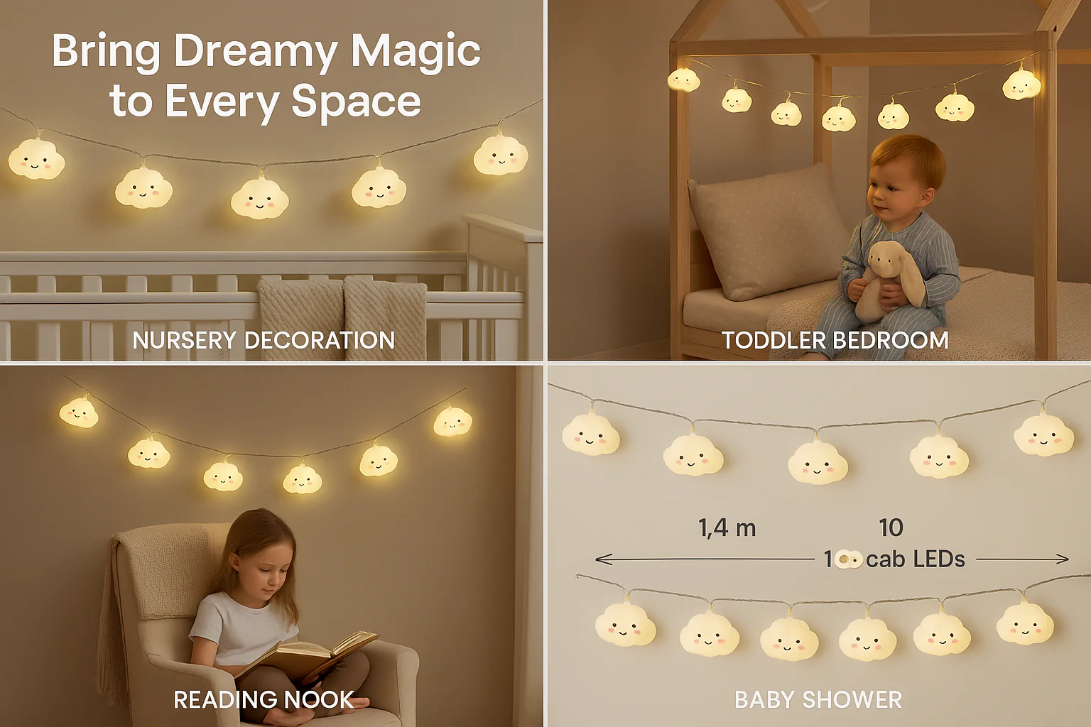 10 LED Cloud create a dreamy and tranquil atmosphere in any indoor space. With charming cloud-shaped light covers and a soft warm white glow (2700K), these lights are perfect for nurseries, bedrooms, playrooms, or cozy reading corners.