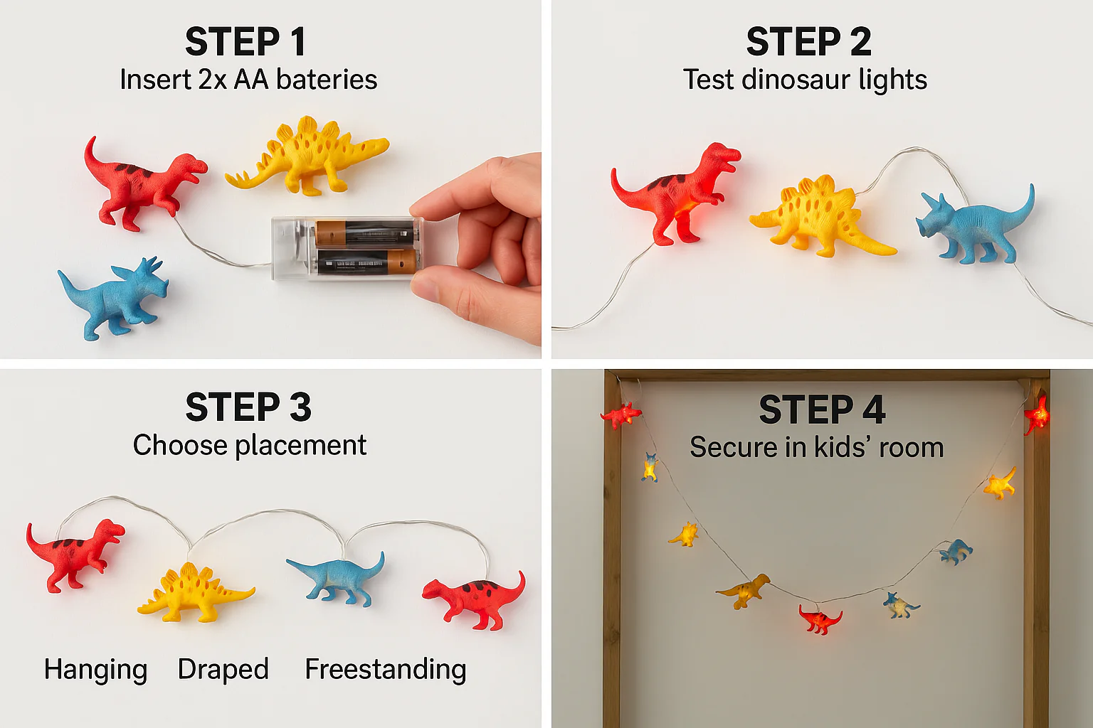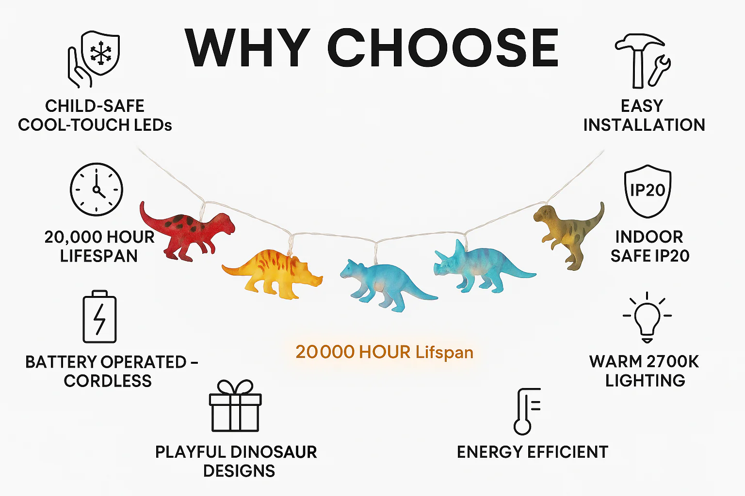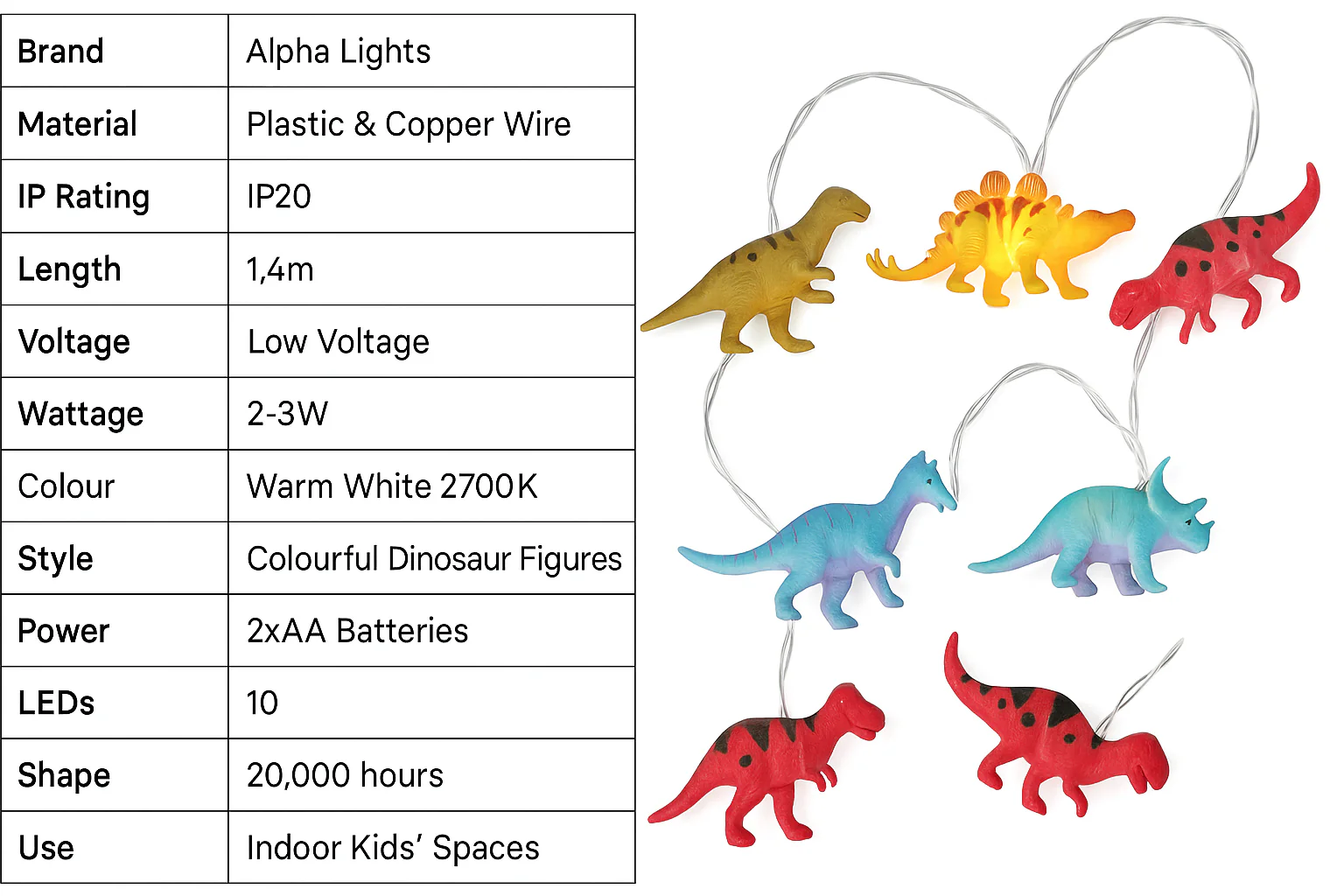 Powered by 2 AA batteries (not included), these lights offer complete portability—no need for sockets or cords. Whether used as a or decoration for dinosaur-themed events, these fairy lights deliver warmth, imagination, and fun while remaining safe and energy-efficient.