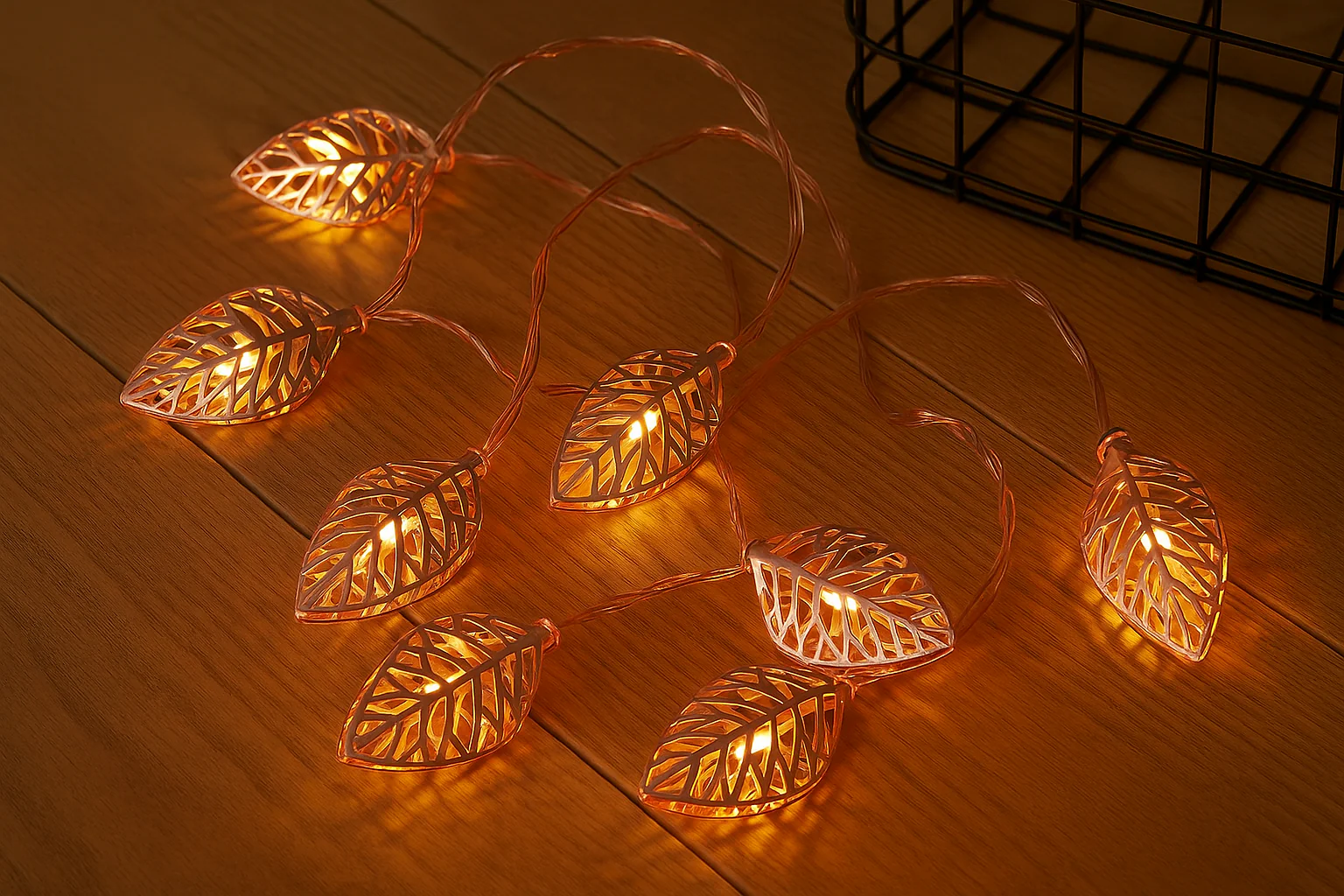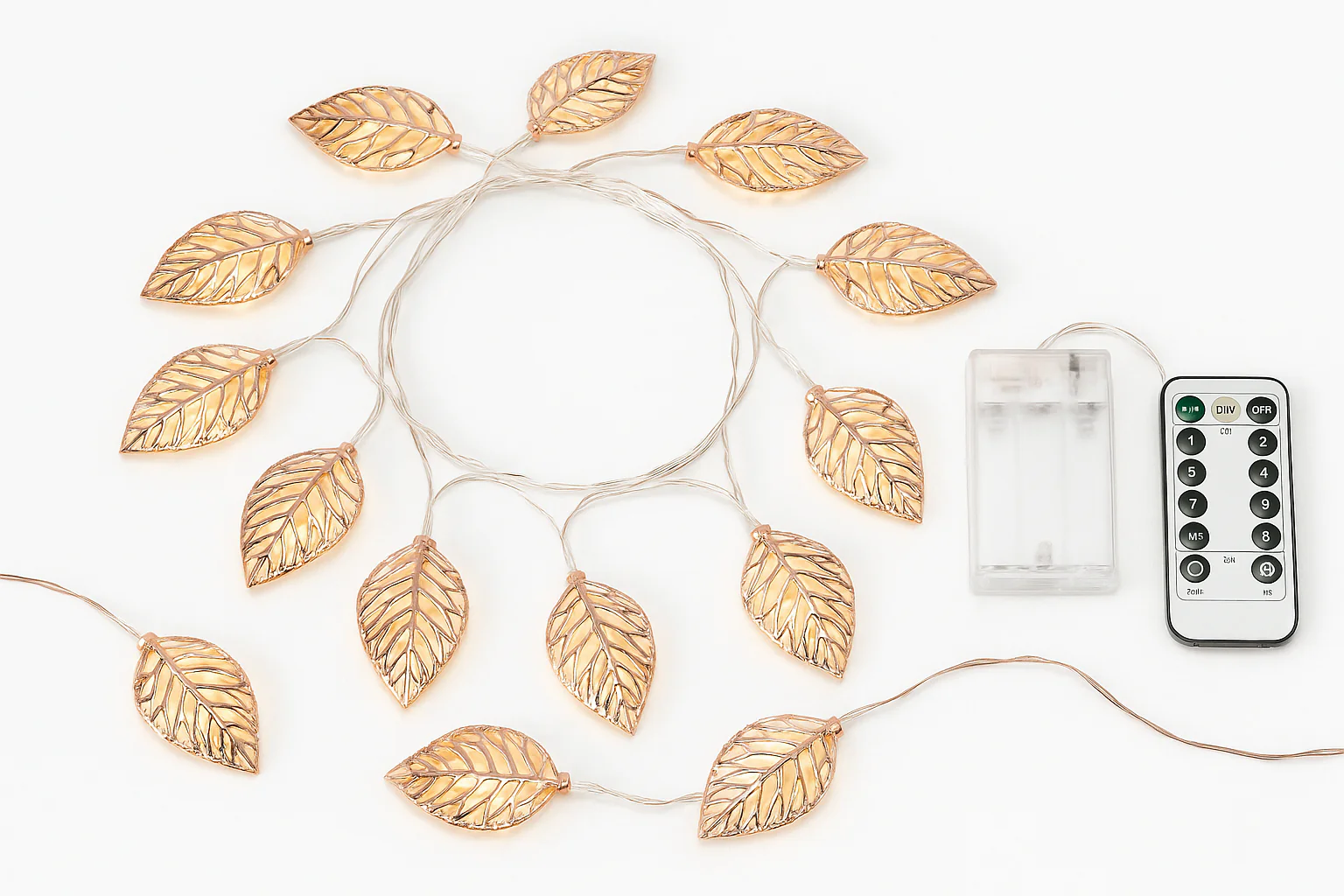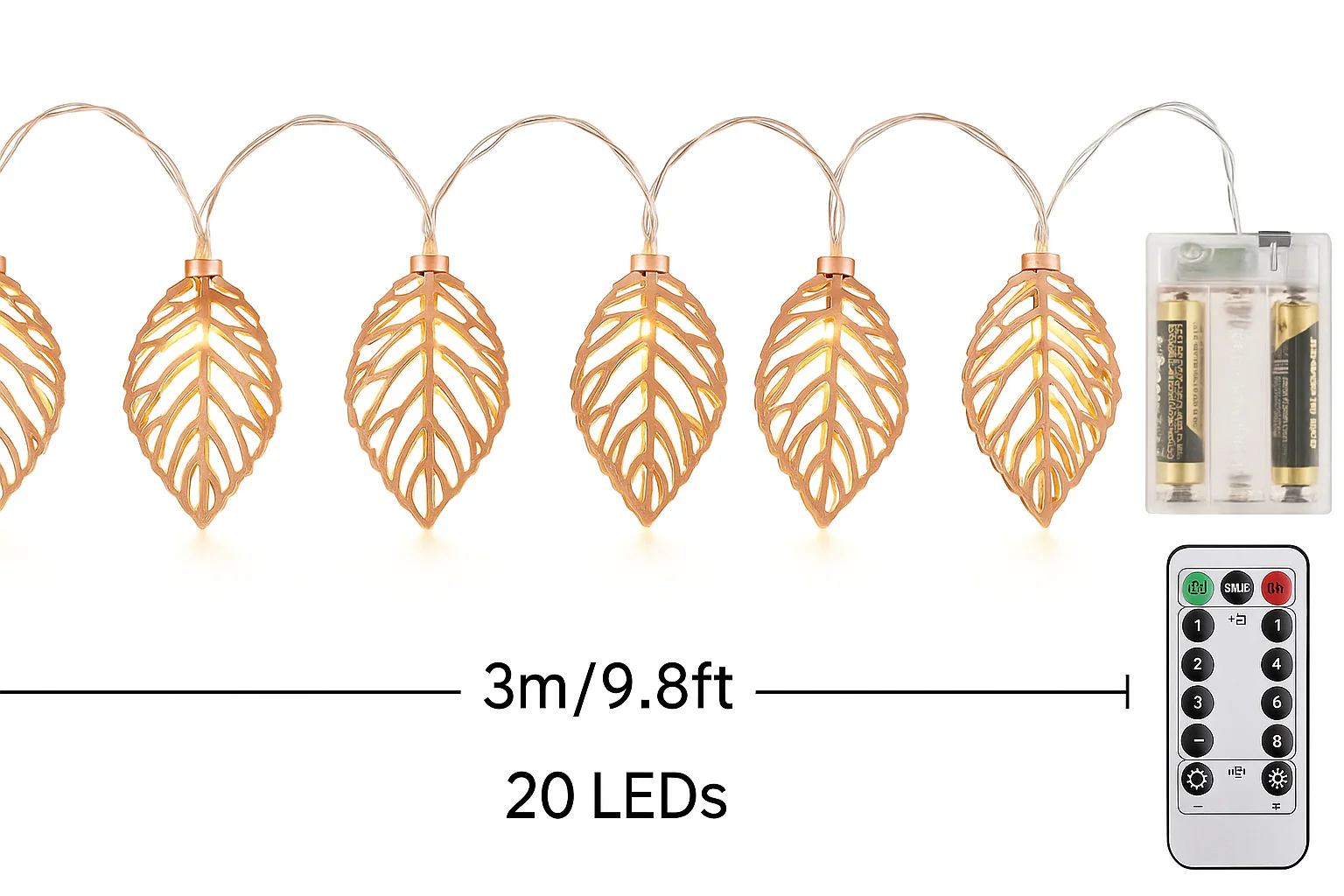 3M length with 20 warm white LED lights in a leaf-style geometric rose gold cover
