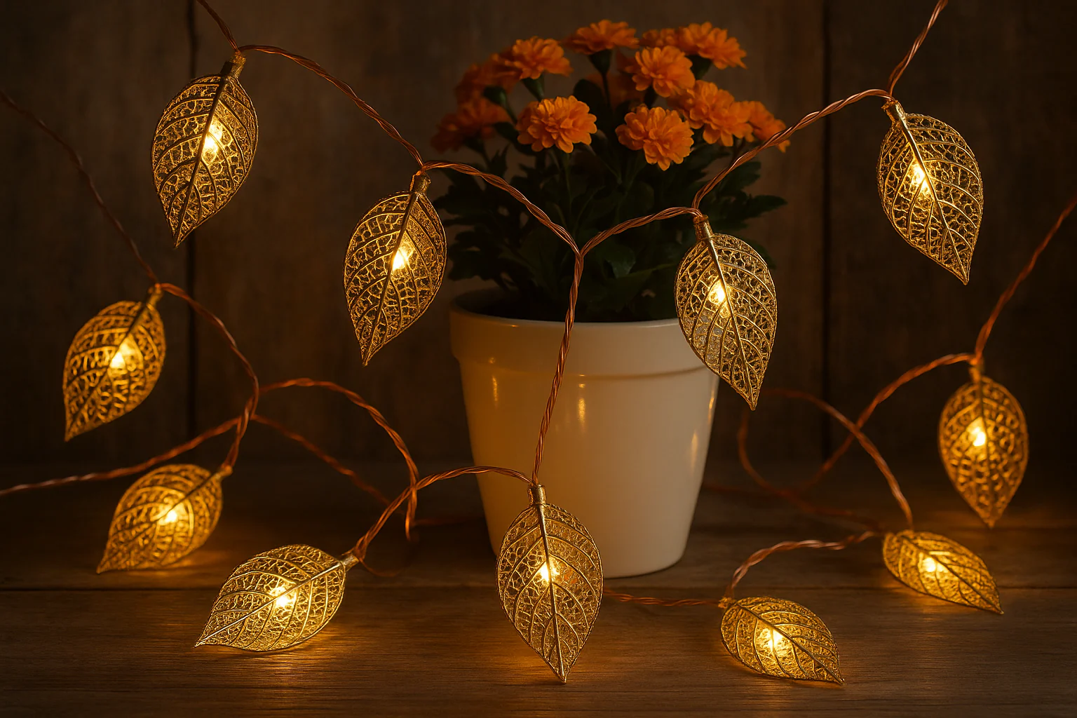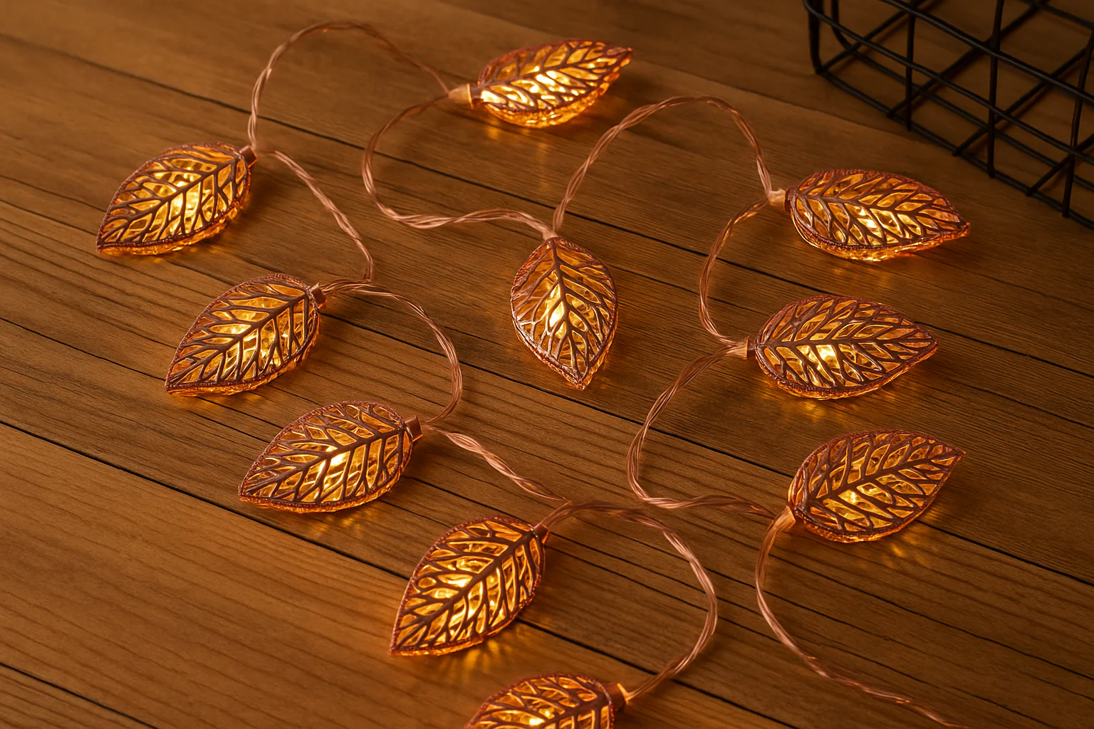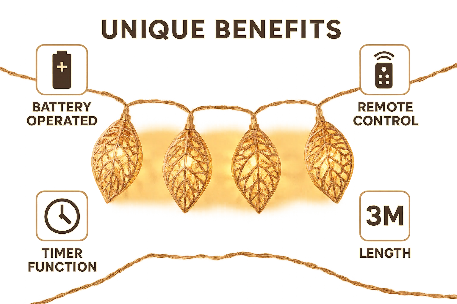 3M length with 20 warm white LED lights in a leaf-style geometric rose gold cover