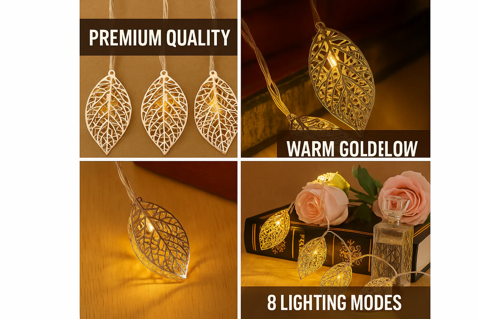 3M Geometric Metal with 20 warm white LEDs and rose gold leaf-shaped covers combine elegance, safety, and portability for beautiful indoor and outdoor lighting. With 8 lighting modes and remote control, these battery-operated fairy lights are perfect for bedrooms, weddings, parties, or creating ambient mood lighting around your home or event.