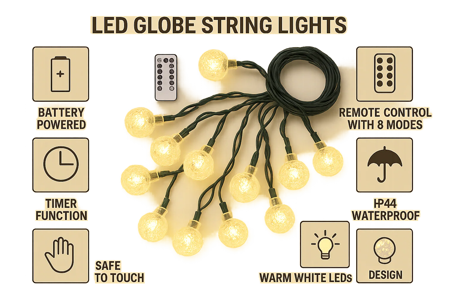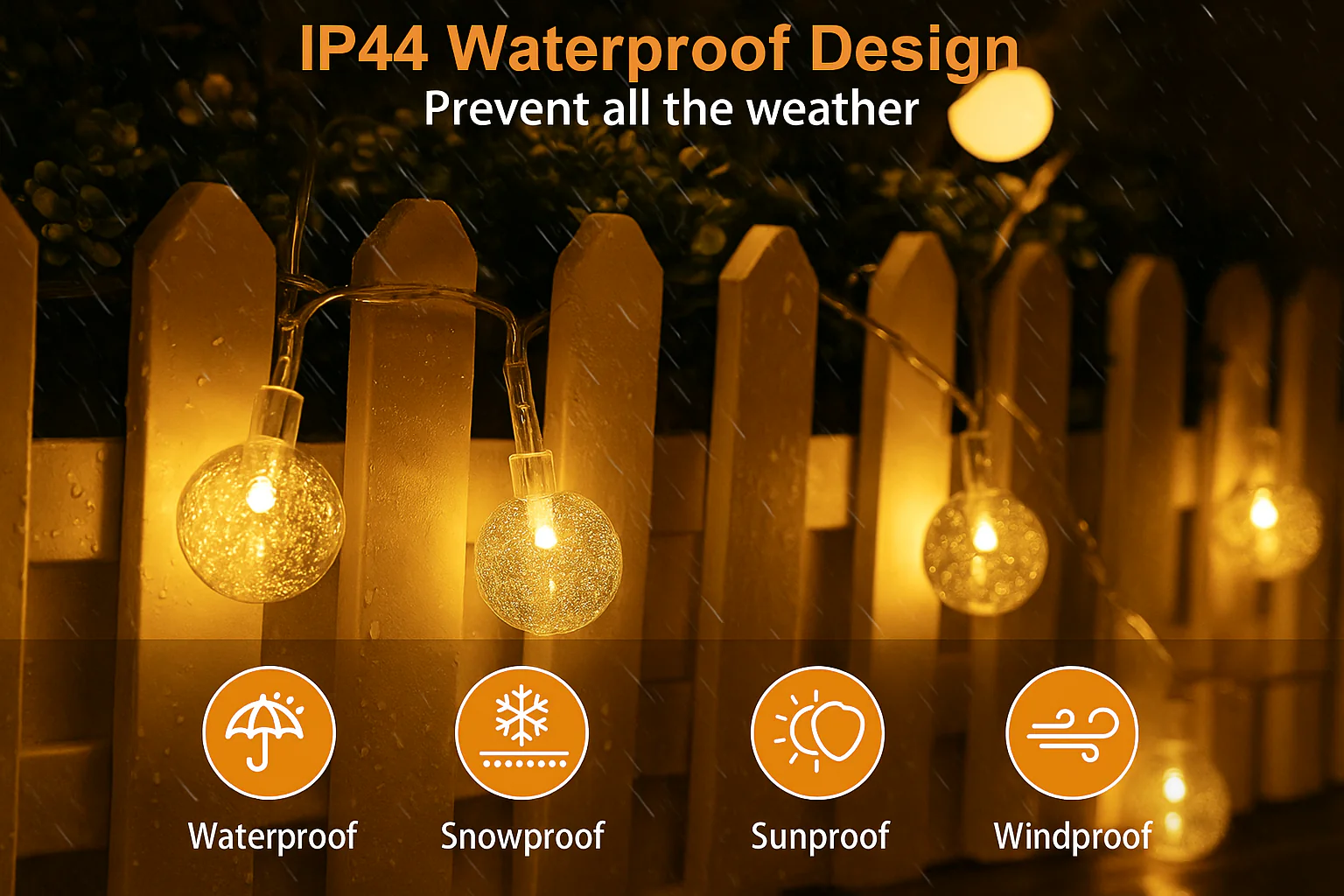Built with IP65-rated waterproofing and , this light chain is ideal for year-round use. The included remote control lets you switch between light effects, adjust brightness, and control timers—making this the perfect lighting solution for convenience and creative flair.