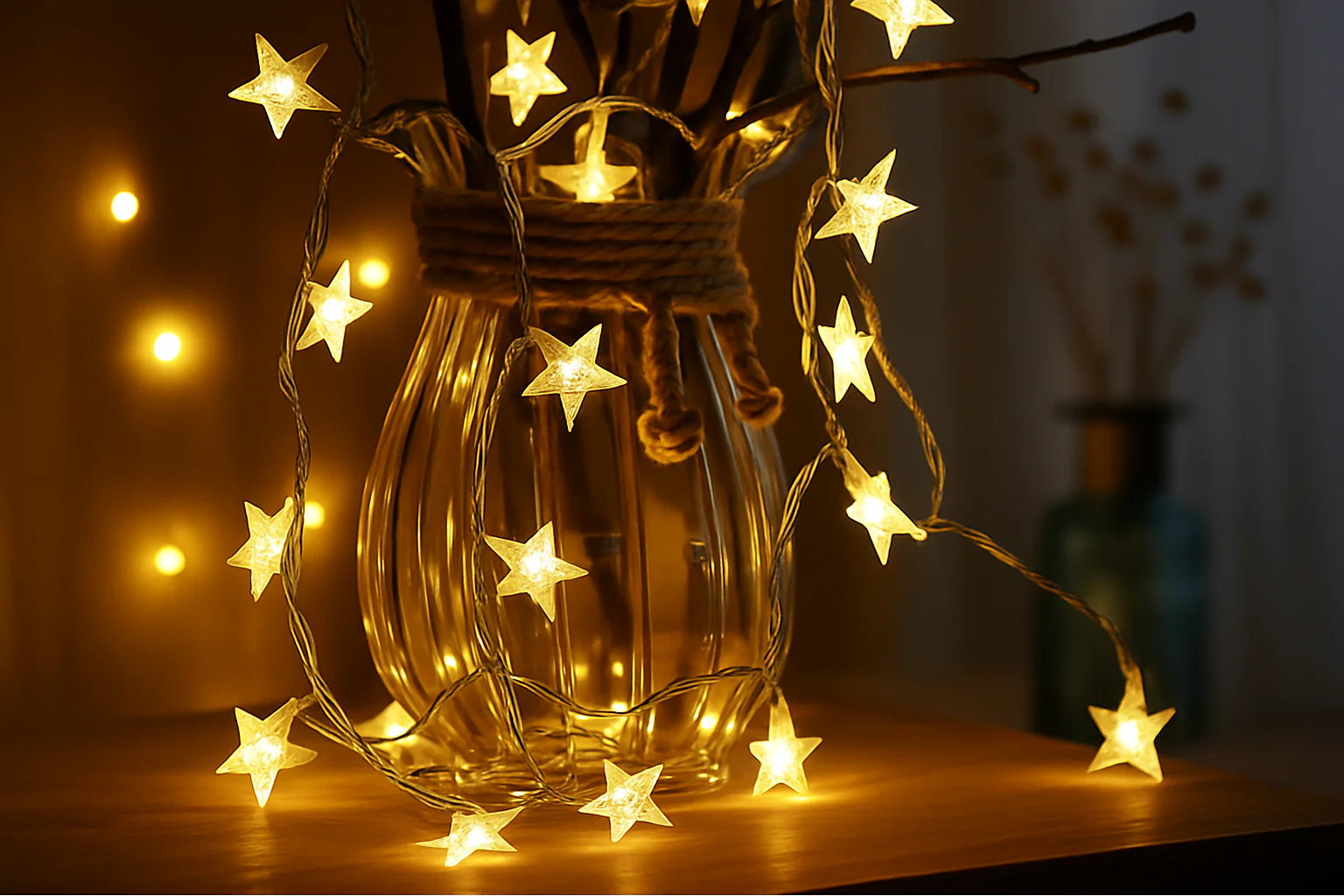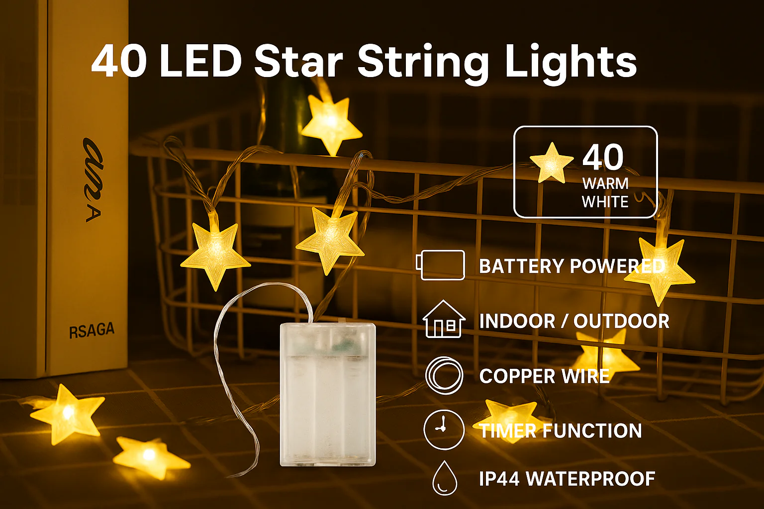 40 LED Battery-Powered Star String Fairy Lights – Warm White – Indoor & Outdoor Use