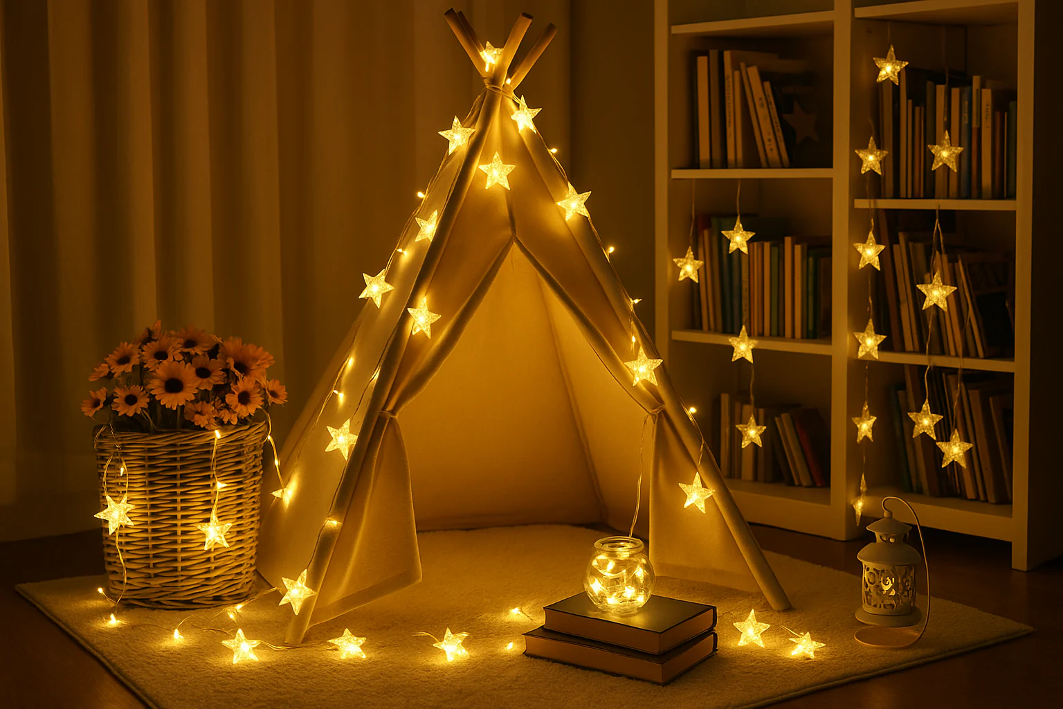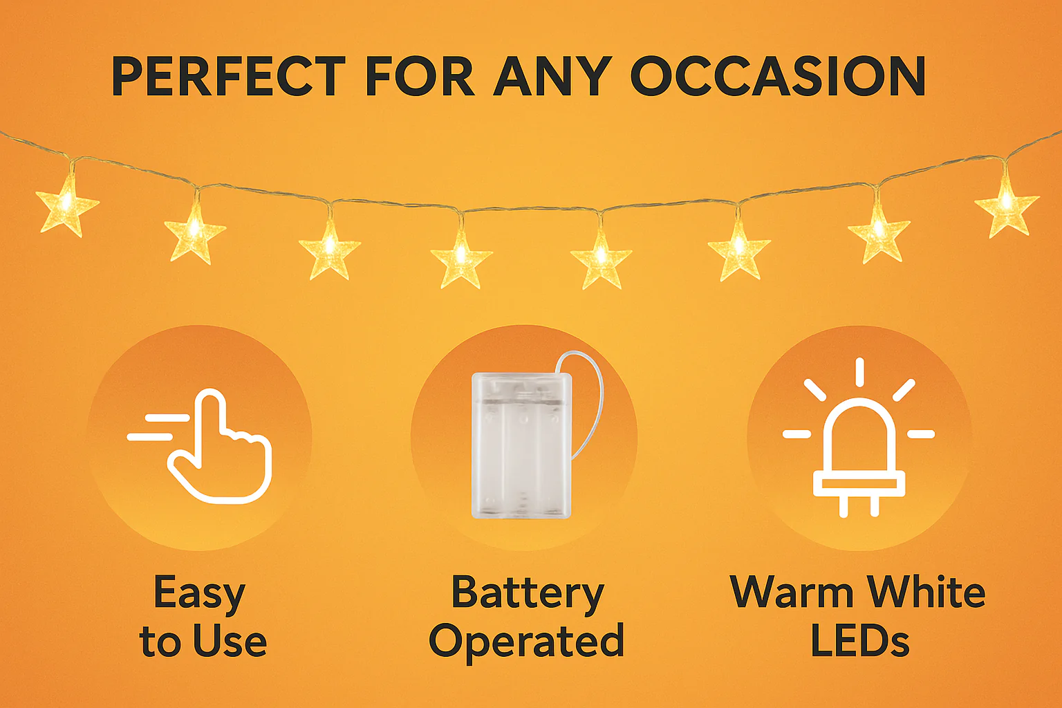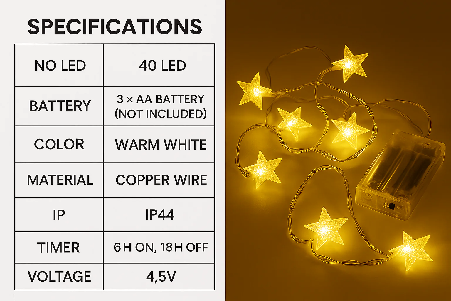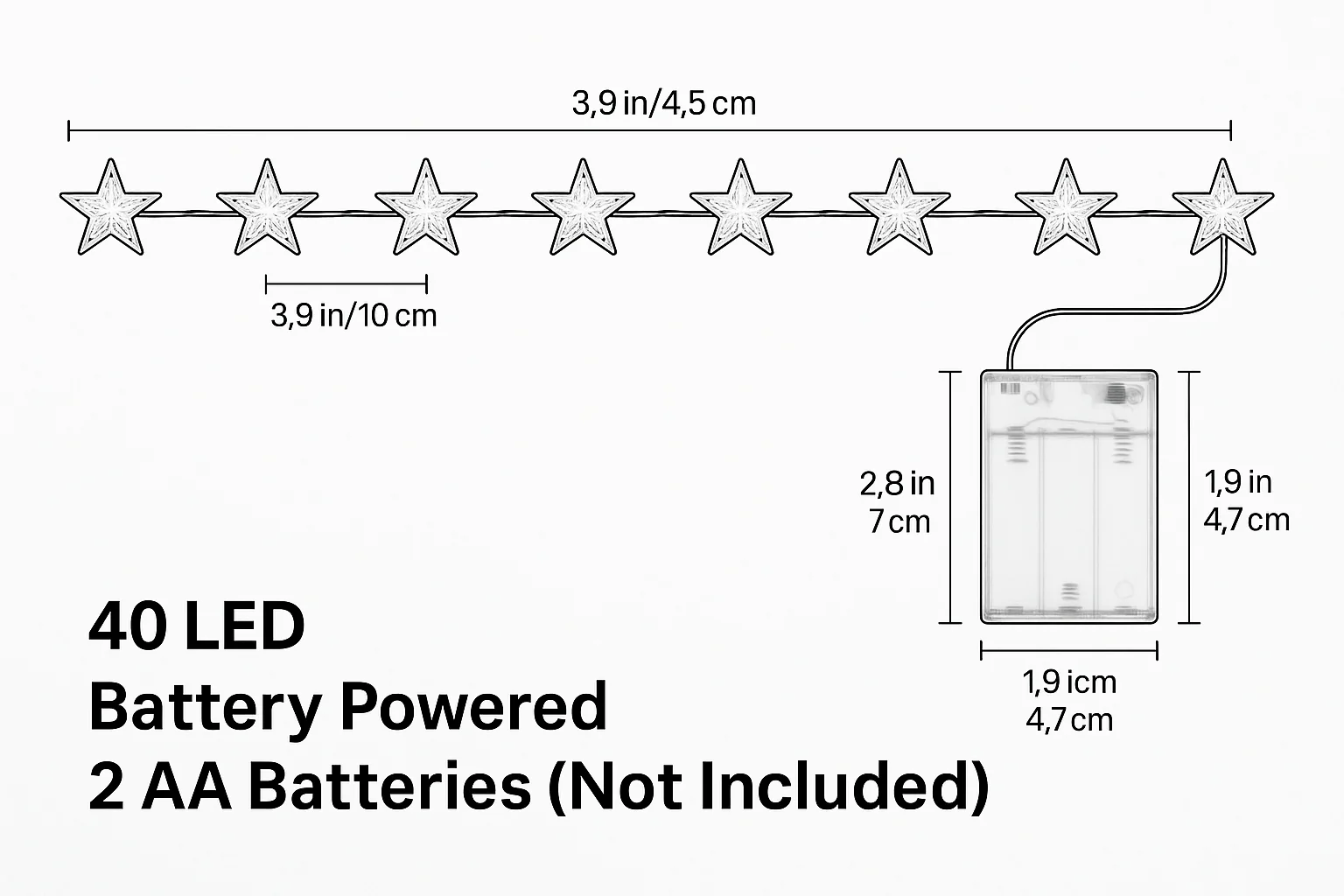 40 LED Battery-Powered bring a dreamy, decorative glow to any indoor or outdoor space. Featuring a charming five-pointed star design and warm white 3000K LEDs, these lightweight fairy lights are perfect for bedrooms, dorms, windows, parties, or seasonal celebrations.