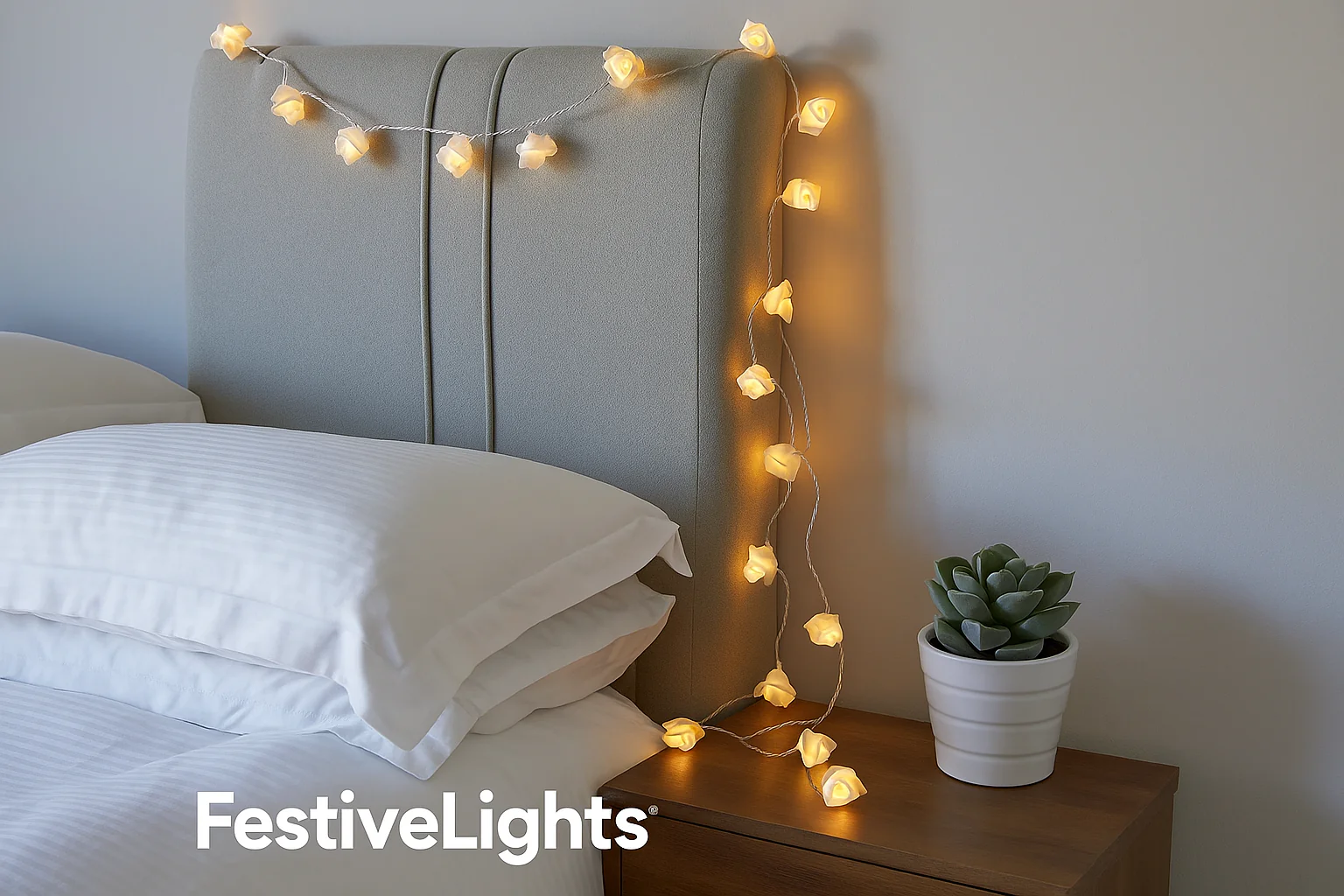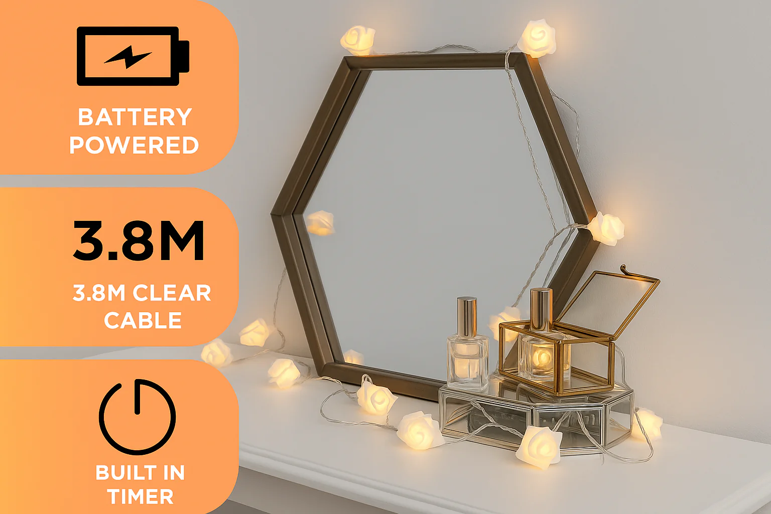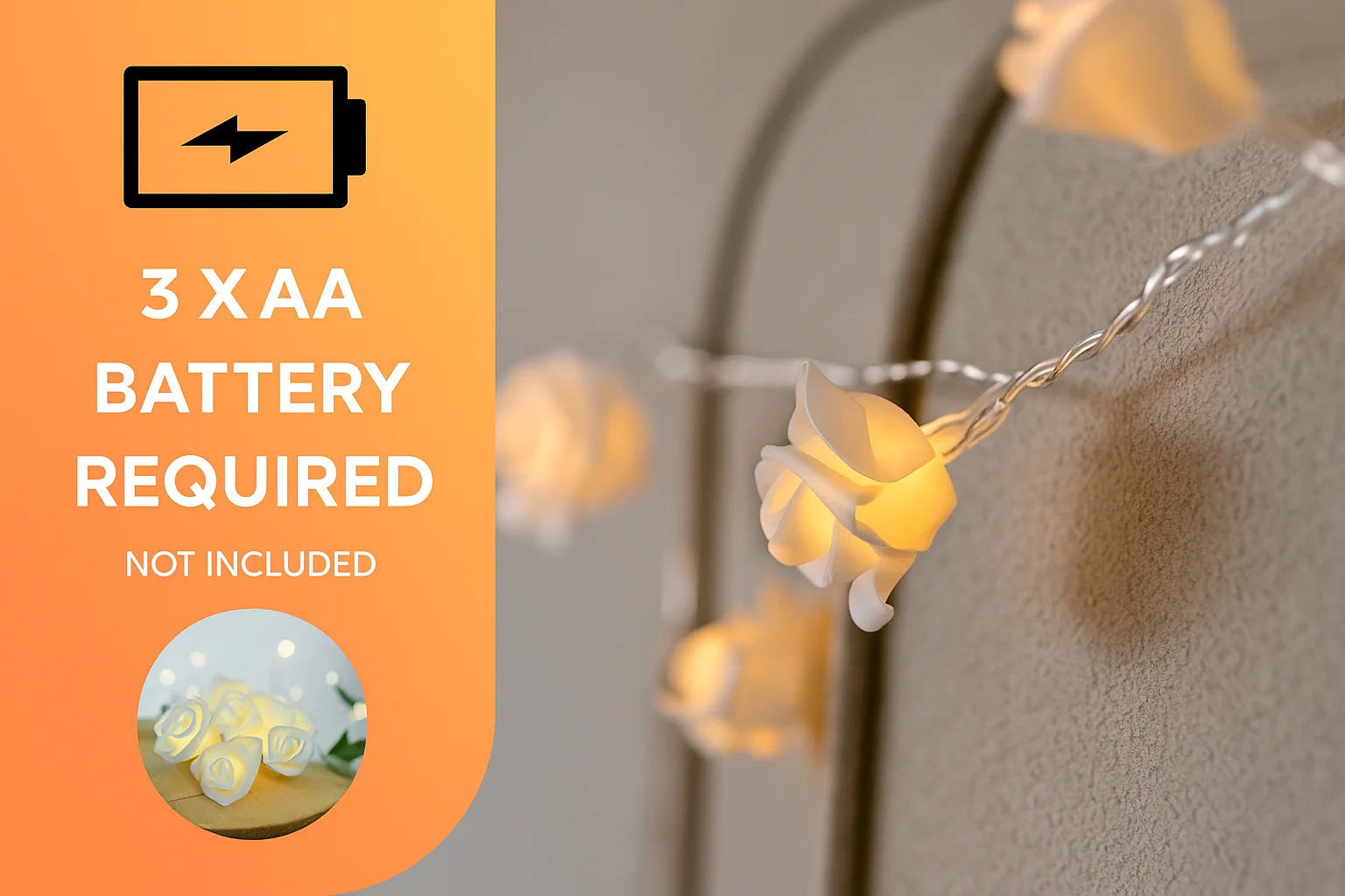 Our 4M White Rose Flower LED Fairy String Lights. These romantic battery-powered lights feature intricately designed white rose blossoms on a clear cable, glowing with warm white LEDs. Perfect for bedroom decor, weddings, parties, or gifting, these lights add a floral, feminine touch to any indoor setting. Powered by batteries for portability and easy setup, they’re ideal for cozy corners, headboards, mirrors, and more.