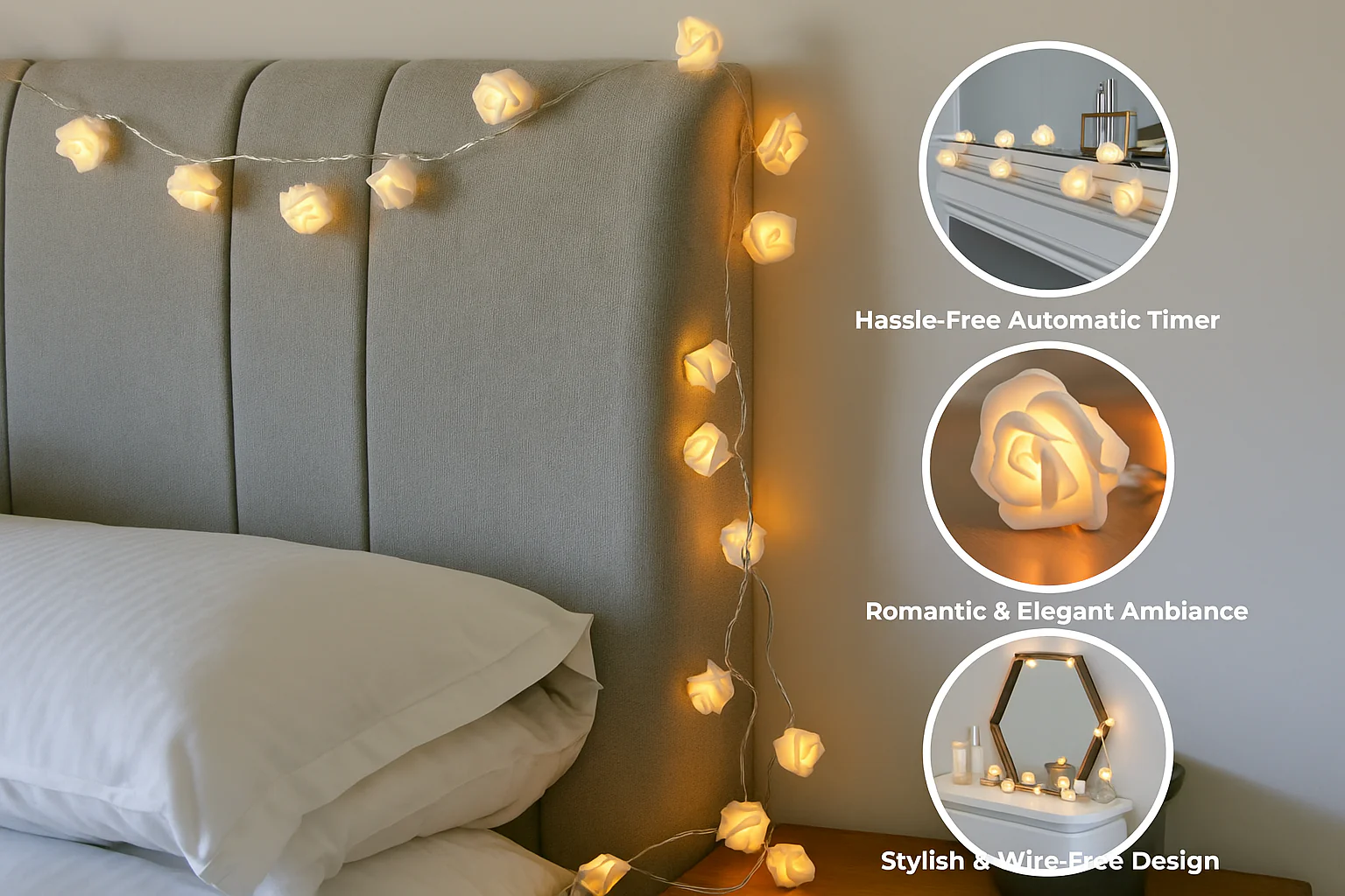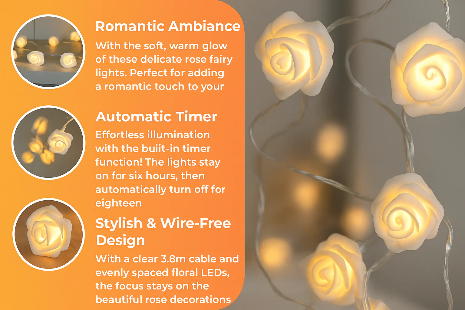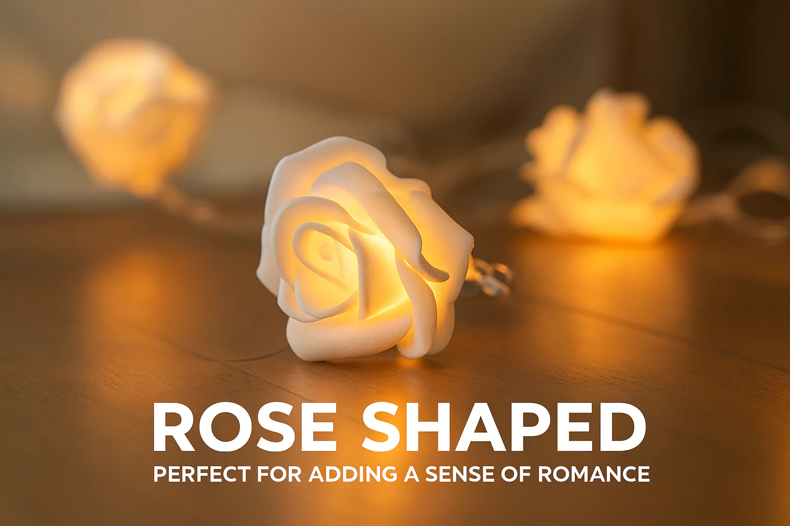 Each LED is adorned with a lifelike white rose flower, creating a gentle and romantic atmosphere in any room.