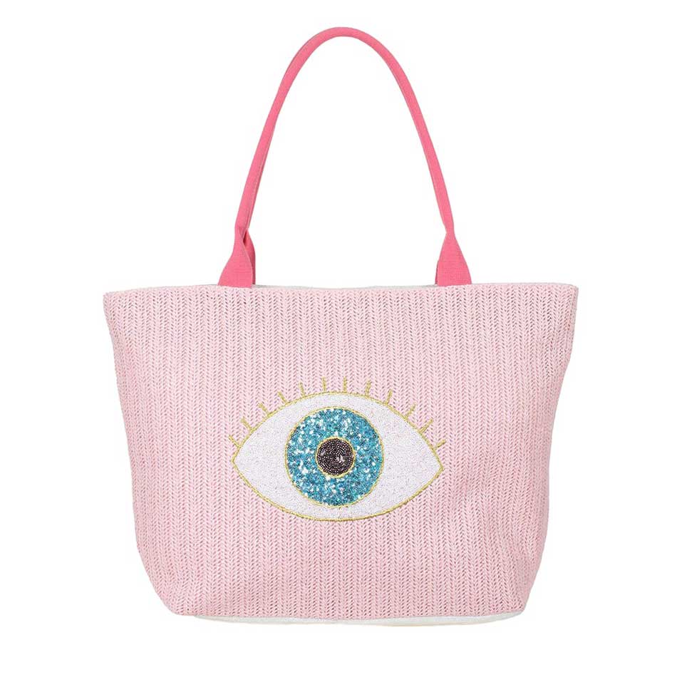 The captivating design features an intricate evil eye motif, adding a unique touch to its aesthetic appeal. The tote is lined with a soft fabric to protect your belongings, and it includes a spacious interior perfect for carrying your essentials, whether you’re headed to the beach, market, or just taking a stroll around town.