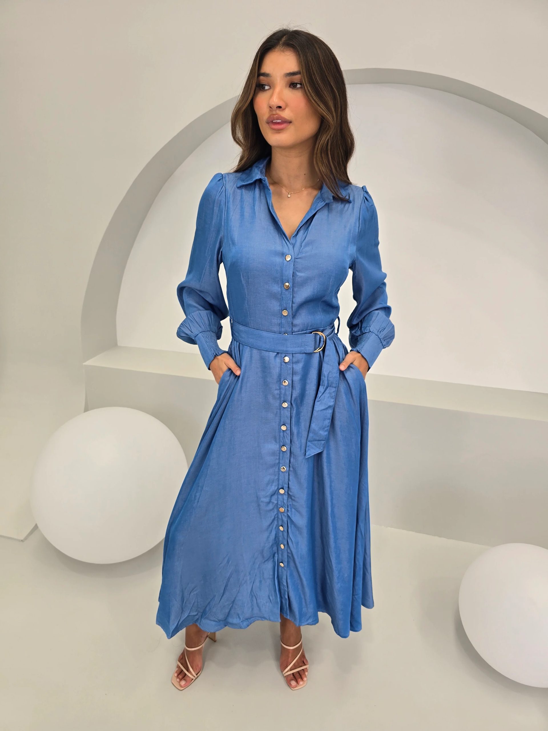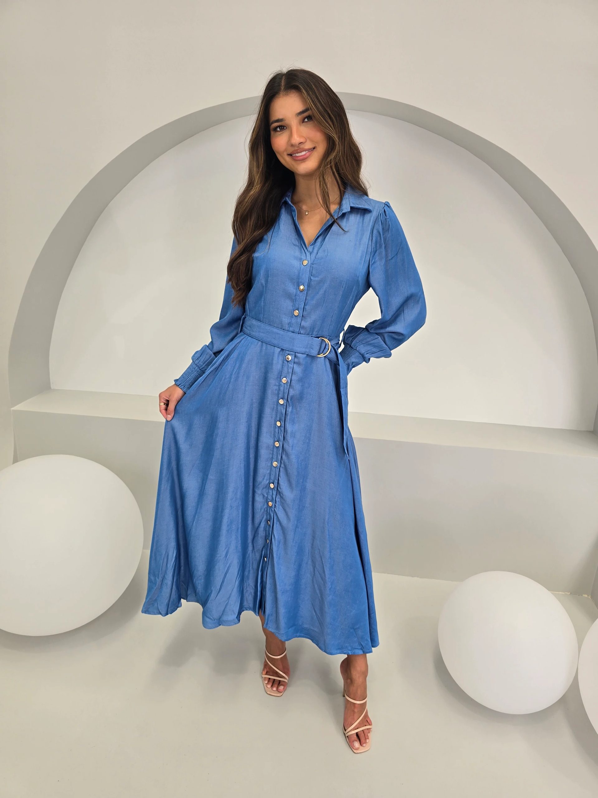 The dress features a button-down front and comes with a matching fabric belt to accentuate the waistline. Long sleeves with subtle gathering at the cuffs add an extra touch of elegance. The flowy silhouette allows for easy movement, ensuring you feel as good as you look throughout the day.
