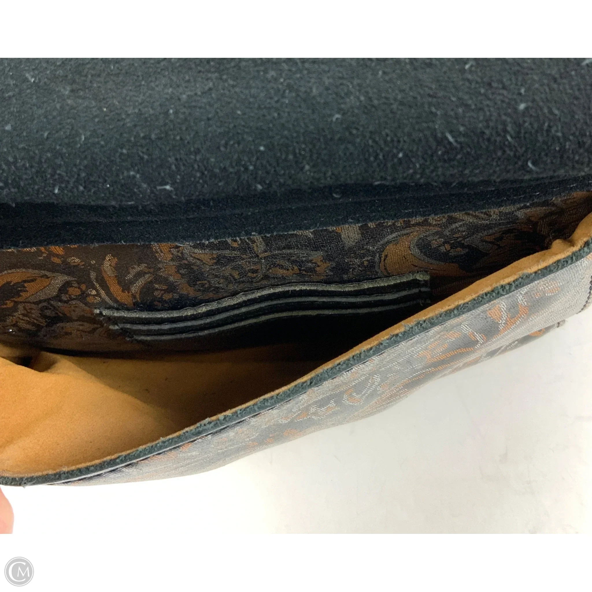 This exquisite shoulder bag is crafted from high-quality faux leather, offering a durable yet stylish accessory that complements any outfit. The bag features an intricate floral print in subtle gold accents set against a deep gray background, creating a timeless elegance.