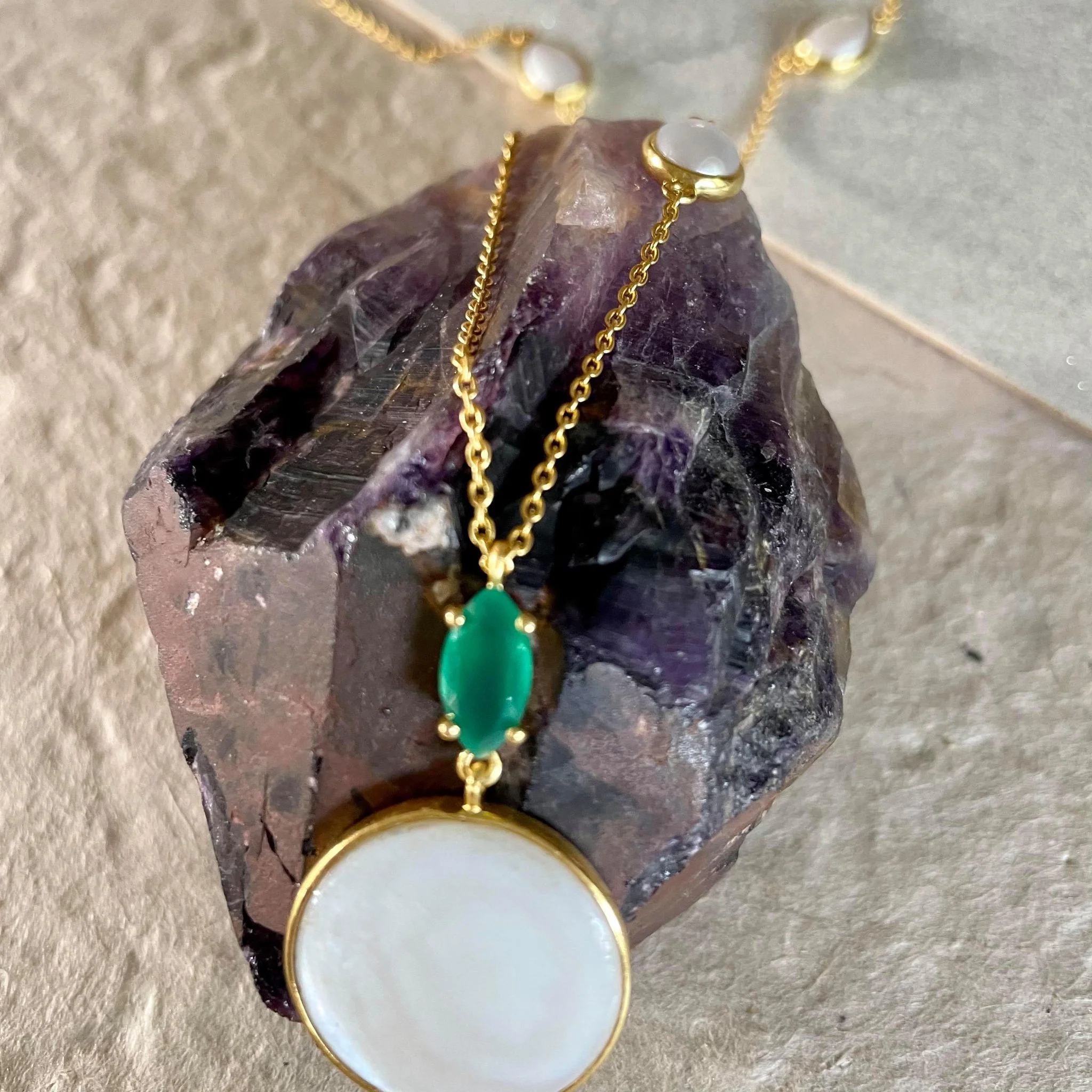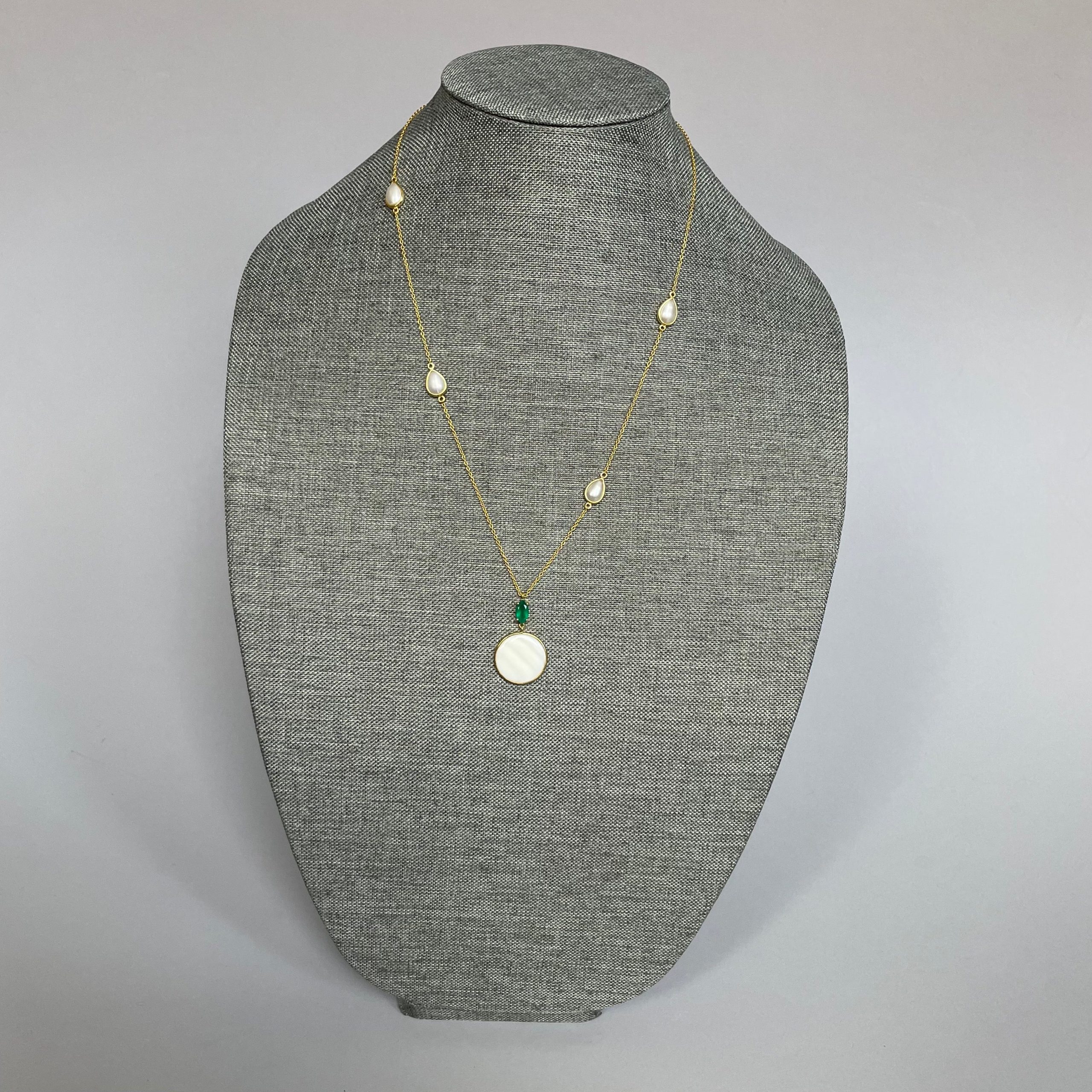 Discover timeless elegance with this beautifully crafted gemstone pendant necklace. This accessory combines style and affordability, making it a versatile complement to any outfit. Its delicate design showcases an oval green synthetic gemstone and a pearly white resin charm, both secured with a golden-toned alloy frame for added brilliance.