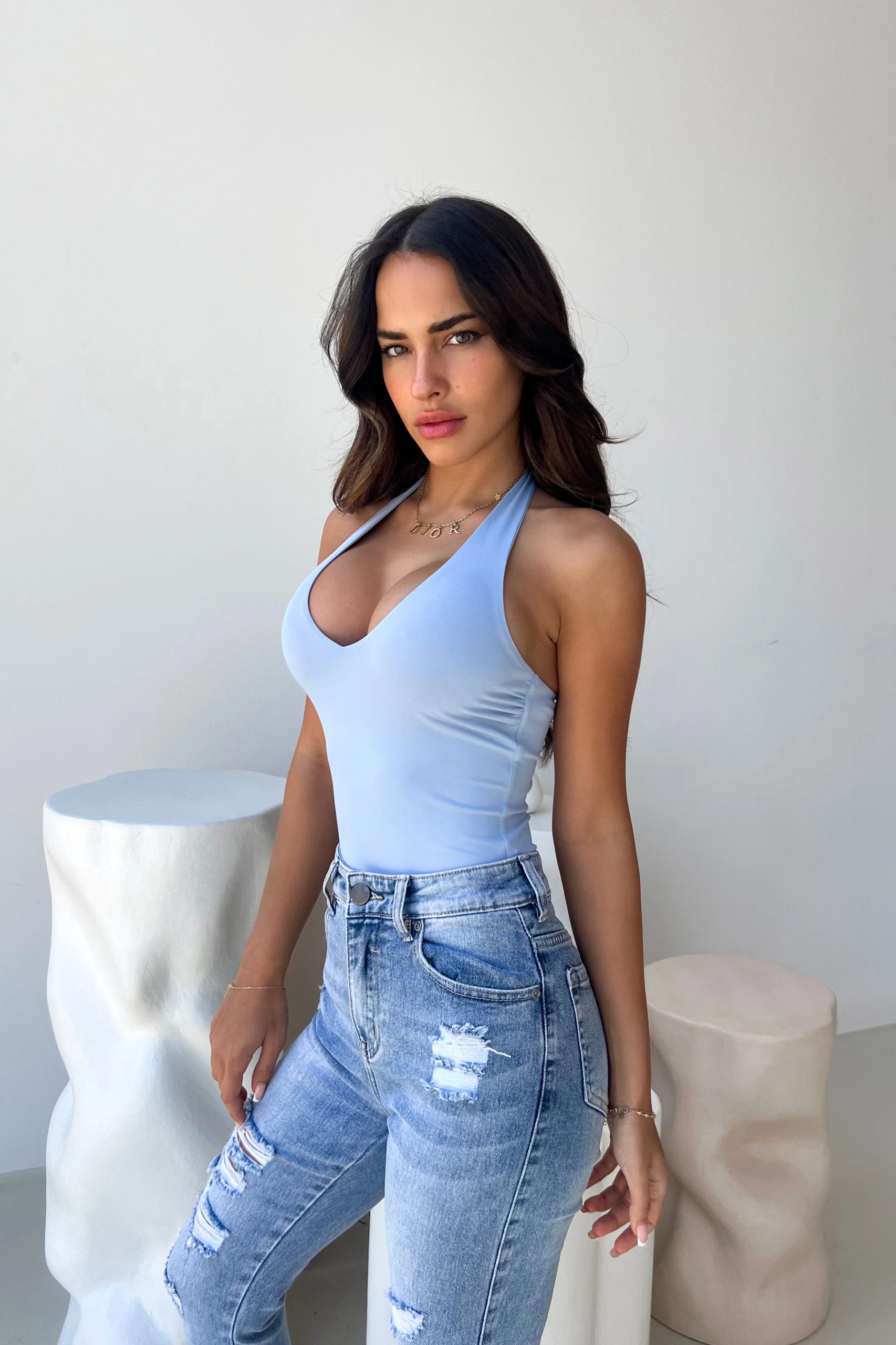 This sophisticated sky blue halter top is designed to accentuate your silhouette with its flattering cut and sleek design. Crafted from a comfortable blend of polyester and spandex, this top offers both stretch and durability, making it perfect for day-long wear. The halter neckline adds a touch of elegance, making it an ideal choice for both casual and formal occasions.