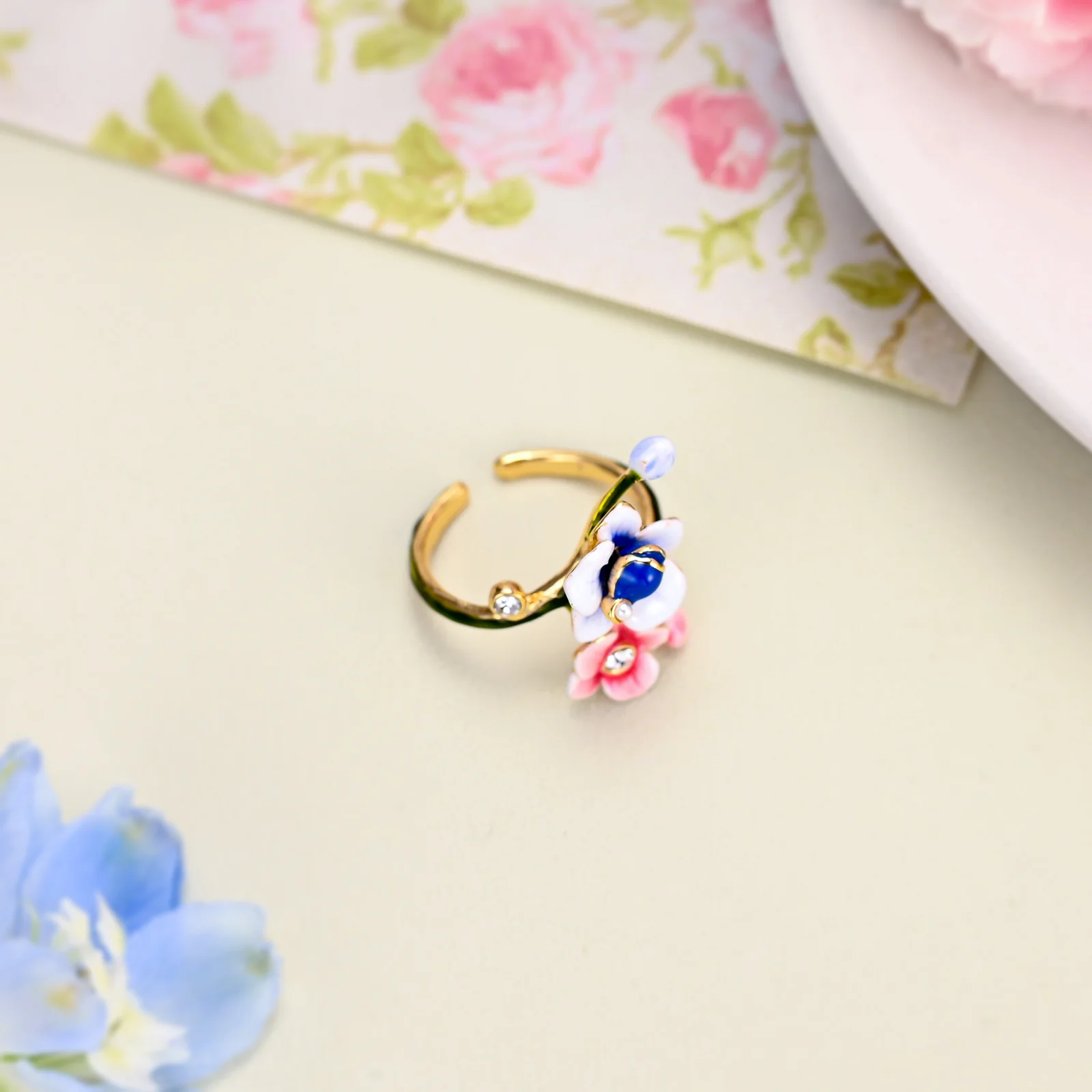 Experience the captivating allure of nature’s beauty with our Enchanting Blossom Ring. This exquisite piece is meticulously crafted from durable brass, ensuring longevity and an affordable elegance. Its adjustable design is adorned with delicate ceramic blossoms in soothing shades of blue and pink, capturing the whimsical charm of a blooming garden.